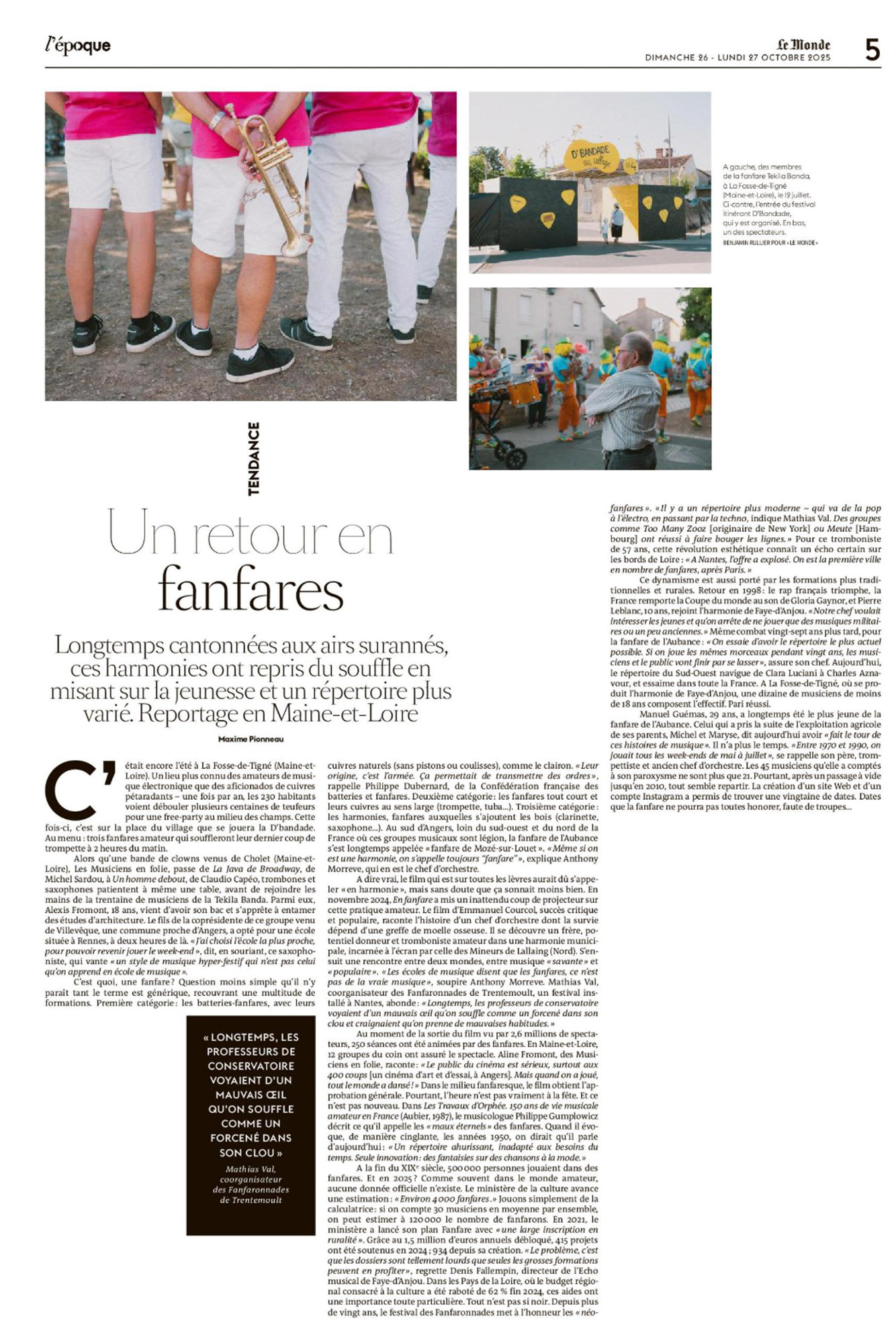 À l’été 2025, j’ai accompagné le journaliste Maxime Pionneau lors d’un rassemblement de fanfares à La-Fosse-de-Tigné. Un article accompagné de photos a été publié dans le supplément L’Epoque du journal Le Monde.